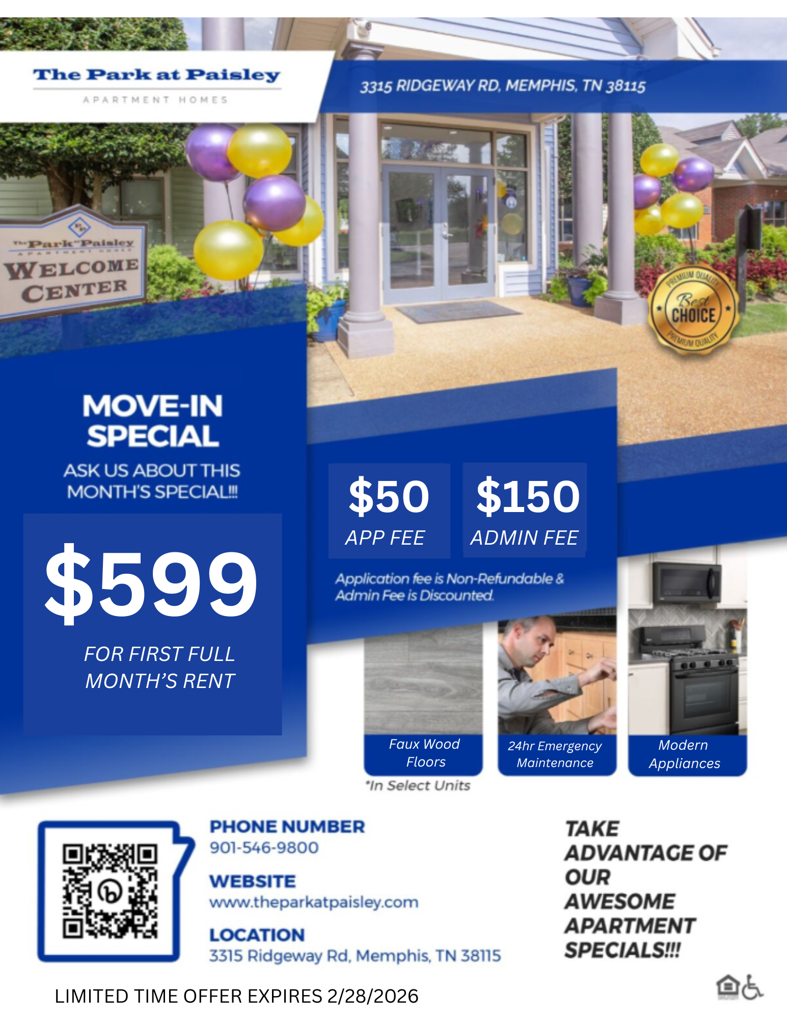 The Park at Paisley is a superior apartment home community located in the heart of stunning Memphis, Tennessee. Conveniently established near Interstates 40, 69, 55, 240, and 269, traveling across the state will be a breeze. We are also nearby fine dining, superb shopping, and thrilling entertainment. Parents will be pleased to discover we are zoned for the prestigious Shelby County School District.